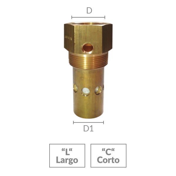 Cuerpo: Latón / Acero Conector: Latón / Acero Resorte: Acero inoxidable Sello: PTFE (Teflón) Conexión: Rosca NPT Presión de trabajo: 250 PSI Temperatura máxima de operación: 100°C